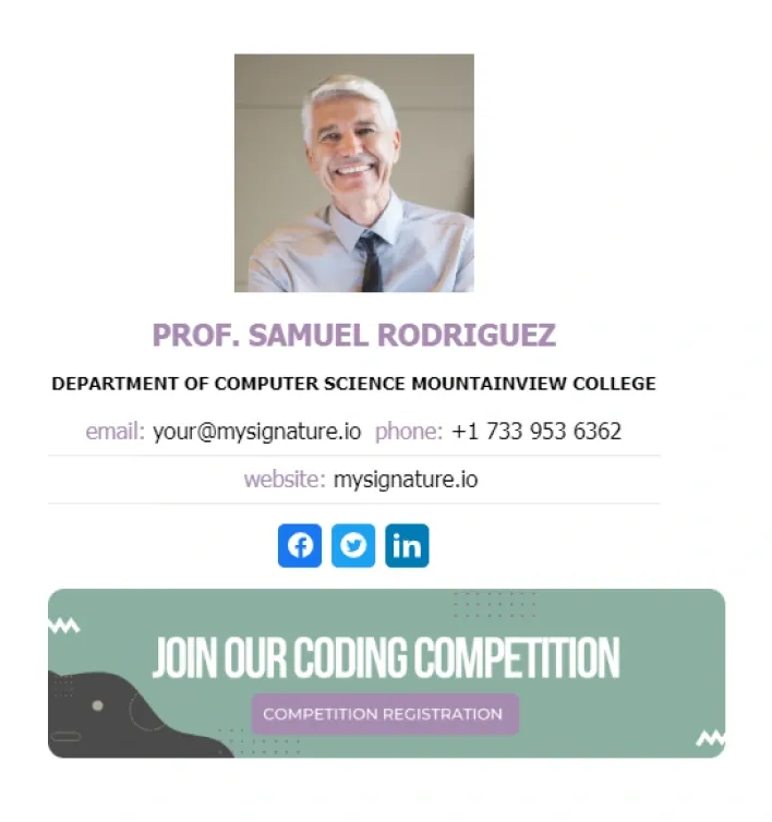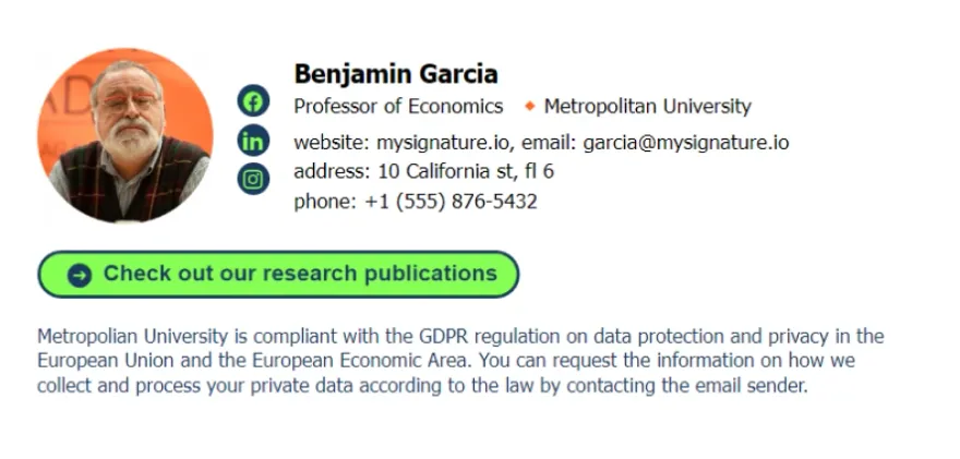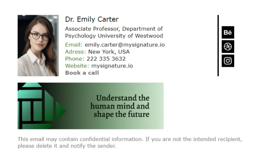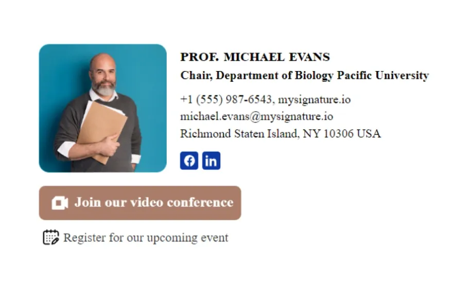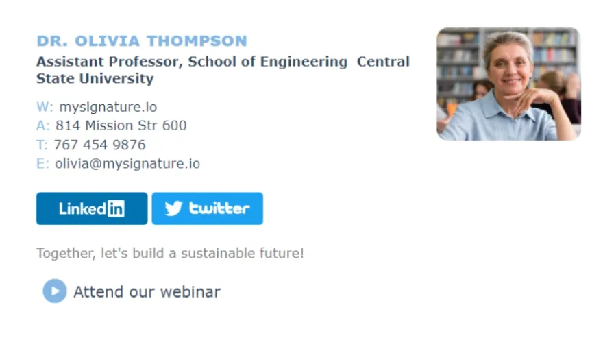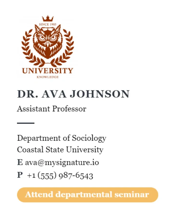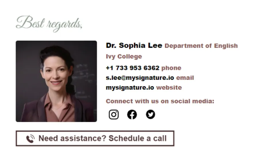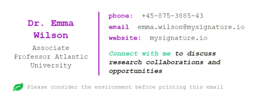 In den nächsten Abschnitten dieses Artikels stellen wir Ihnen einige Beispiele für akademische E-Mail-Signaturen sowie Tipps vor, die Ihnen dabei helfen, eine gute akademische E-Mail-Signatur zu entwerfen, die Ihre berufliche Identität widerspiegelt, Ihre Marke stärkt und Ihre Glaubwürdigkeit in der Community erhöht.