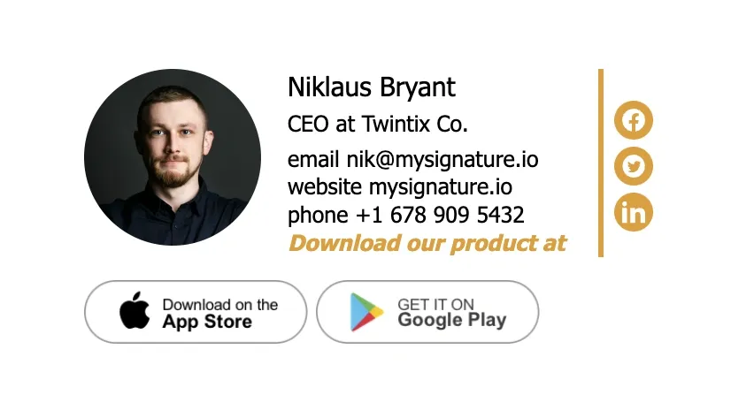 Viele einprägsame Beispiele für CEO-E-Mail-Signaturen enthalten Social-Media-Symbole. Diese helfen dabei, die Social-Media-Profile Ihres Unternehmens (LinkedIn, Facebook, Twitter usw.) aktiv zu bewerben, damit Nutzer leichter über ihre bevorzugten Plattformen mit Ihnen in Kontakt treten können.