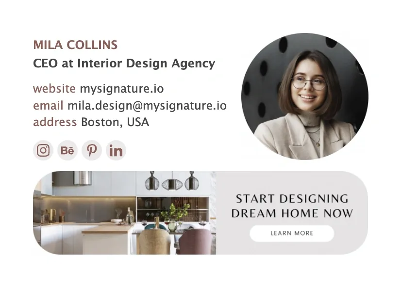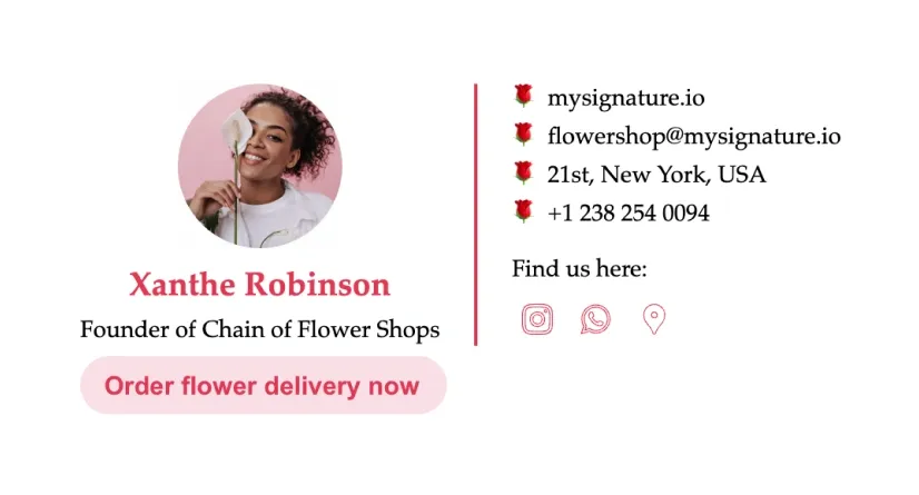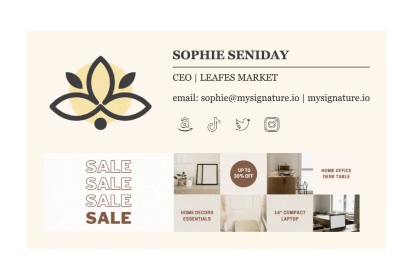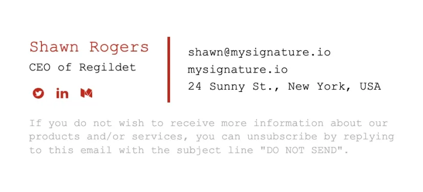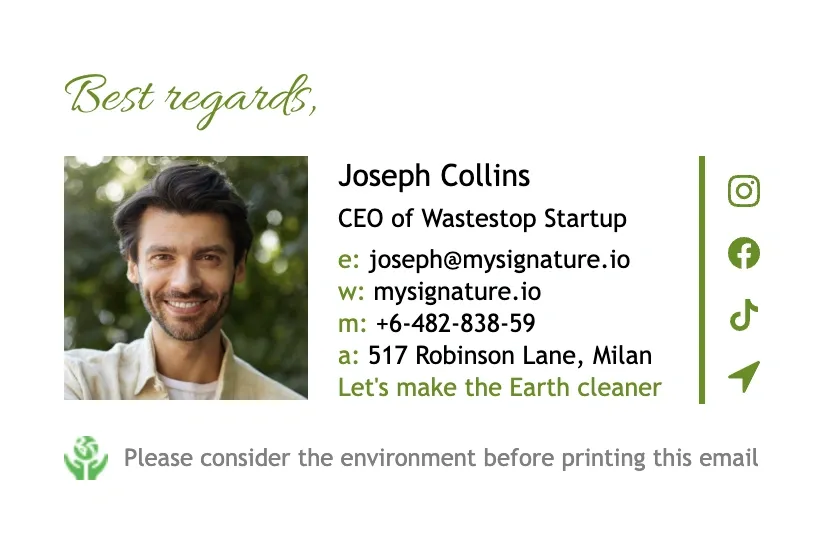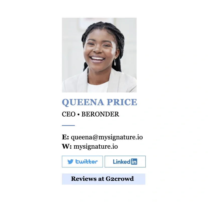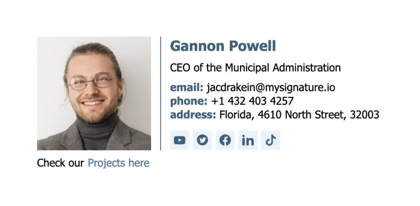CEO-E-Mail-Signatur erstellenVerbessern Sie Ihre E-Mail-Kommunikation mit MySignature. Unser leistungsstarkes Werkzeug bietet eine nahtlose Lösung für die Erstellung beeindruckender und professioneller E-Mail-Signaturen, die speziell für CEOs entwickelt wurden. Mit einer Reihe anpassbarer Vorlagen und Designoptionen können Sie Ihre Führungsqualitäten effektiv zur Geltung bringen und mit jeder E-Mail, die Sie versenden, einen bleibenden Eindruck hinterlassen.