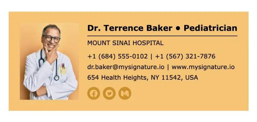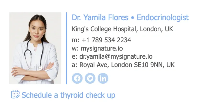 E-Mail-Signatur erstellenDas Einfügen von Links zu Social-Media-Profilen in die E-Mail-Signatur für Ärzte ist optional, aber in der heutigen digitalen Welt kann es nützlich sein, wertvolle Informationen mit Patienten zu teilen. Wenn Sie ein professionelles Social-Media-Profil haben, das in direktem Zusammenhang mit Ihrer Arbeit als Arzt steht, dann kann ein Link dazu Patienten dabei helfen, auf dem Laufenden zu bleiben und mit Ihrer Arztpraxis in Kontakt zu bleiben. Wenn Sie einen guten Generator für Signaturen wie MySignature verwenden, dann können Sie zu Ihrer E-Mail-Fußzeile anklickbare Symbole hinzufügen.