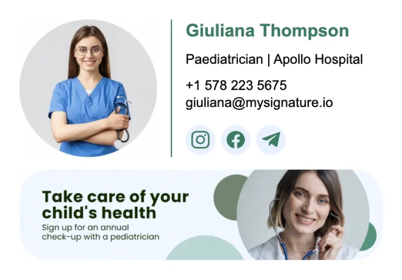 E-Mail-Signatur erstellenBanner können auffällig sein und die Aufmerksamkeit auf wichtige Informationen lenken, sollten aber sparsam und nur dann eingesetzt werden, wenn sie für die zu vermittelnde Botschaft relevant sind. Ärzte können sie in E-Mail-Signaturen verwenden, um eine Gesundheitsveranstaltung oder Konferenz anzukündigen, an der sie teilnehmen, ihre Zugehörigkeit zu einem bestimmten Krankenhaus oder einer medizinischen Organisation zu zeigen, gesundheitsbezogene Ressourcen zu bewerben usw.