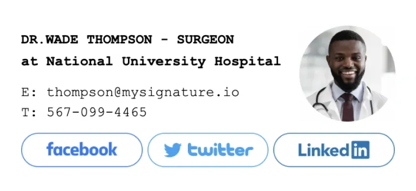 Ein professionelles Foto in Ihrer Mediziner-E-Mail-Signatur kann sich positiv darauf auswirken, wie andere Sie wahrnehmen. Umgekehrt kann ein Foto von schlechter Qualität Ihre Glaubwürdigkeit und Professionalität schnell untergraben. Deshalb ist es wichtig, in ein hochwertiges Foto zu investieren, das Sie genau repräsentiert und dazu beiträgt, Vertrauen bei Ihren Empfängern aufzubauen. Sie können auch das Logo des Krankenhauses/der Arztpraxis hinzufügen, um eine sofortige Wiedererkennbarkeit Ihrer Marke zu erreichen und Ihrer E-Mail-Kommunikation ein zusätzliches Element der Professionalität zu verleihen.
