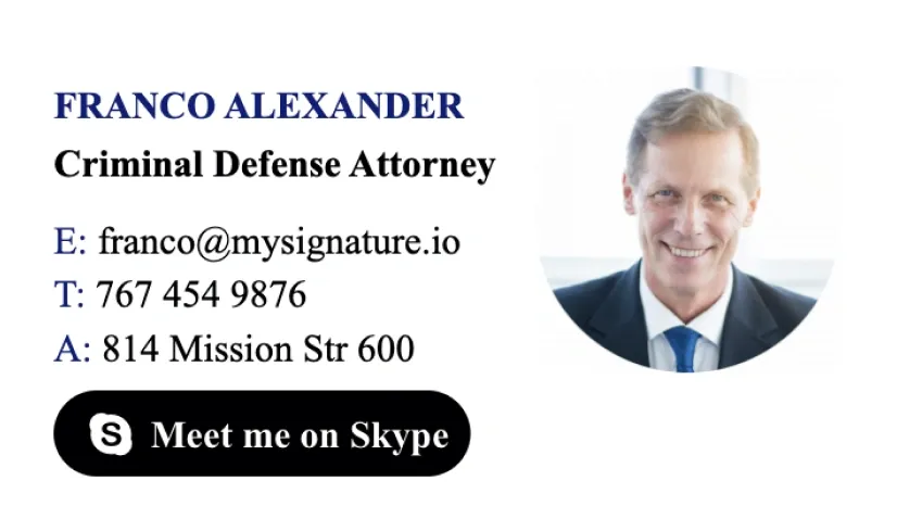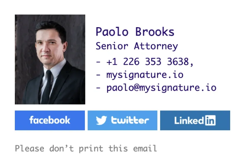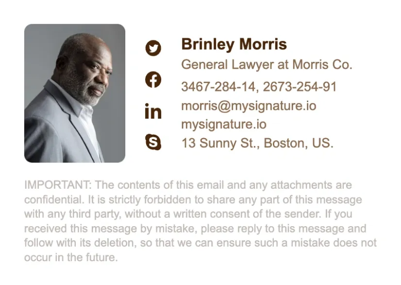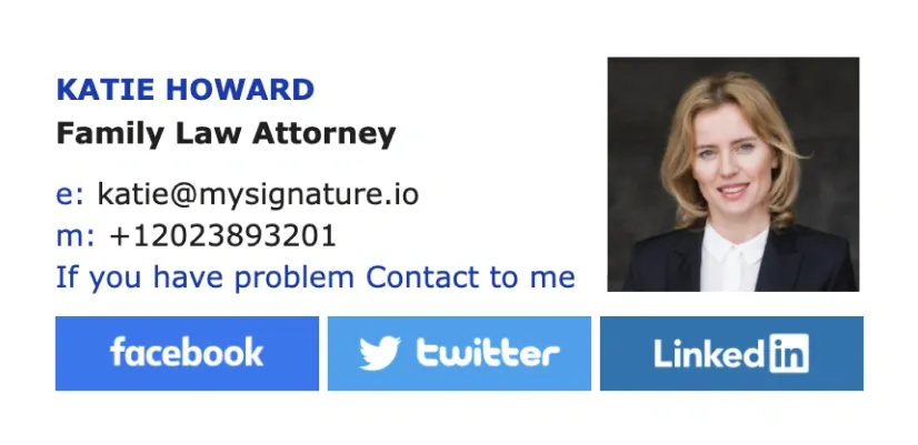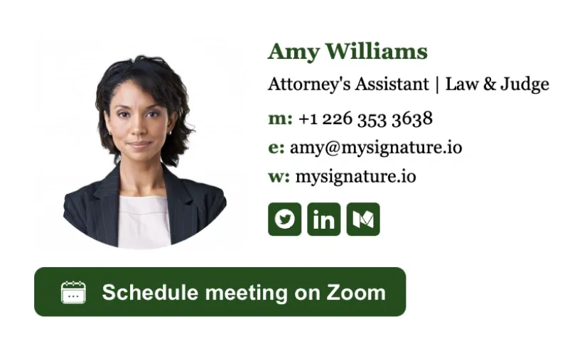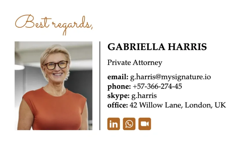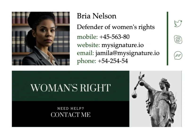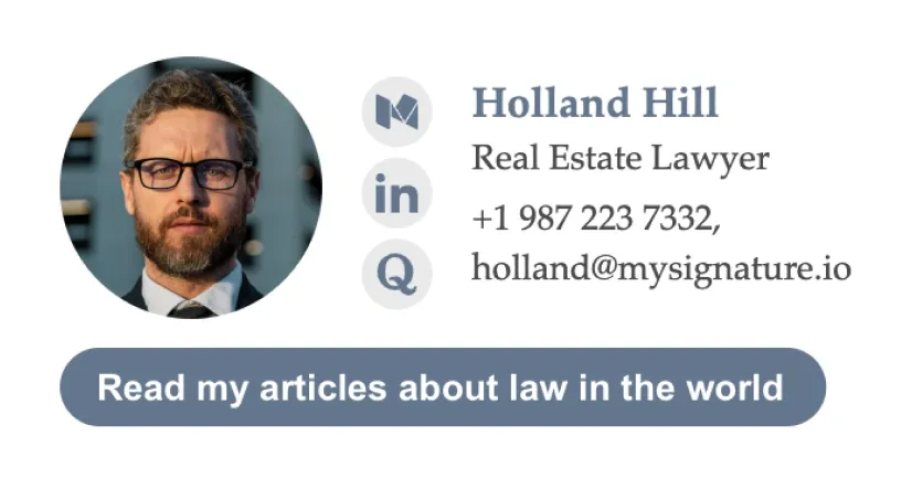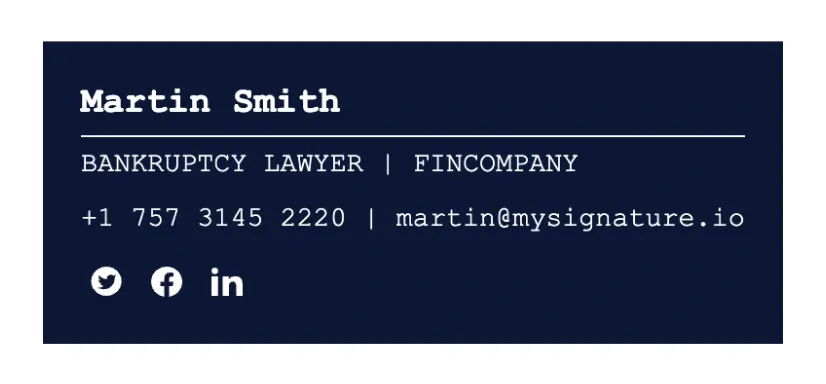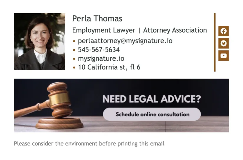 Die Beispiele für Anwalts-E-Mail-Signaturen können Anwälten und Juristen dabei helfen, übersichtliche und aussagekräftige E-Mail-Fußzeilen zu erstellen. In diesem Abschnitt finden Sie die besten Vorlagen für Anwalts-E-Mail-Signaturen, die mit unserem Generator für E-Mail-Signaturen erstellt wurden, d.h. mit MySignature.
